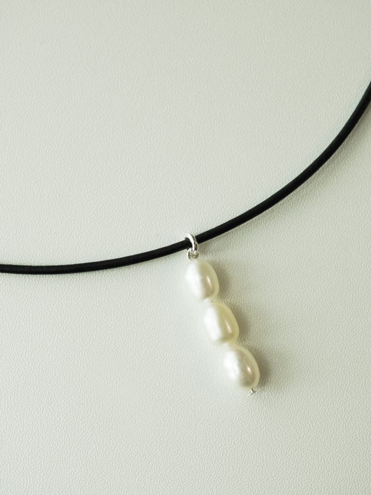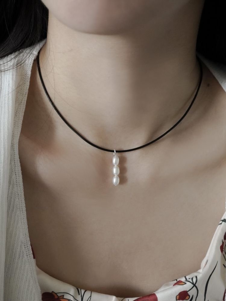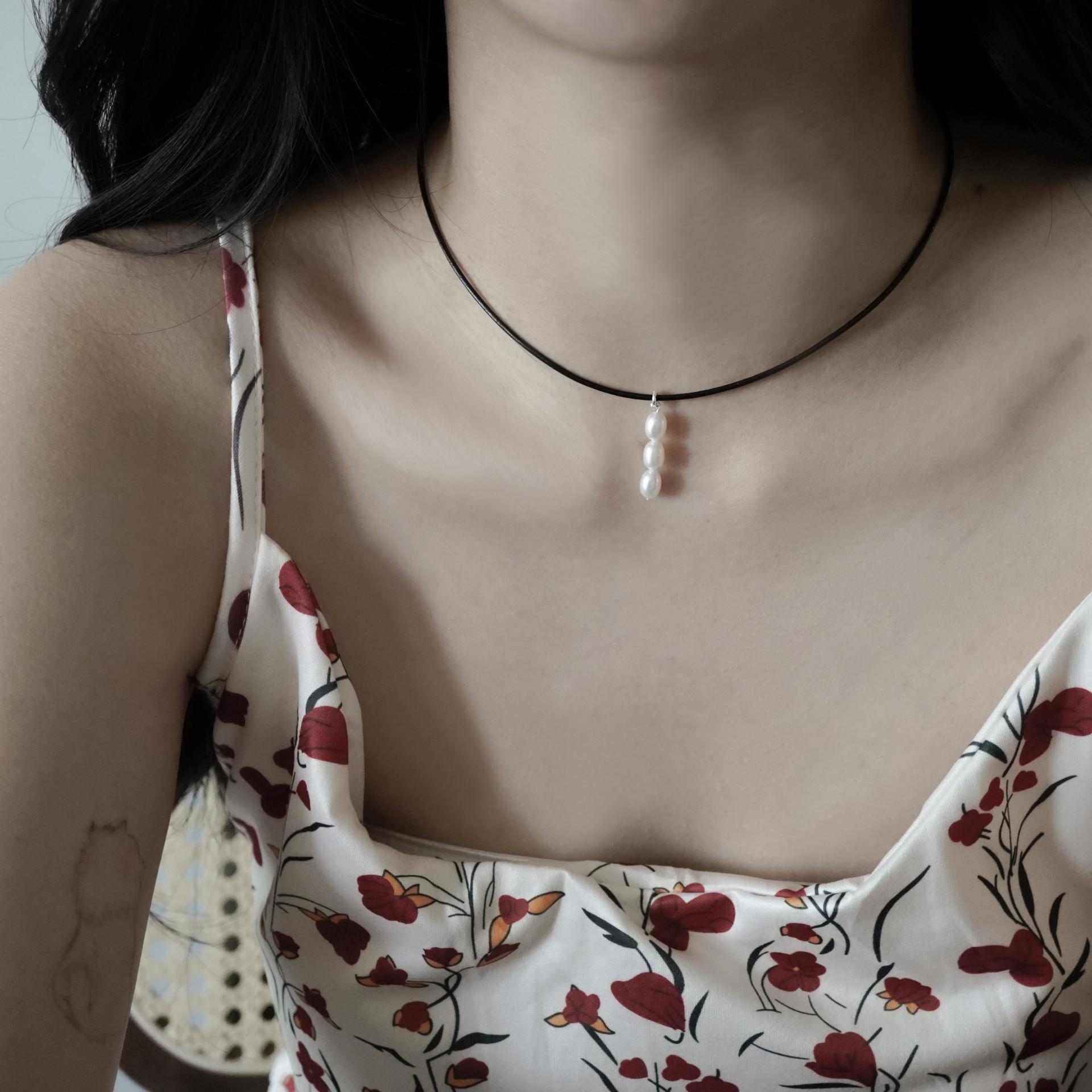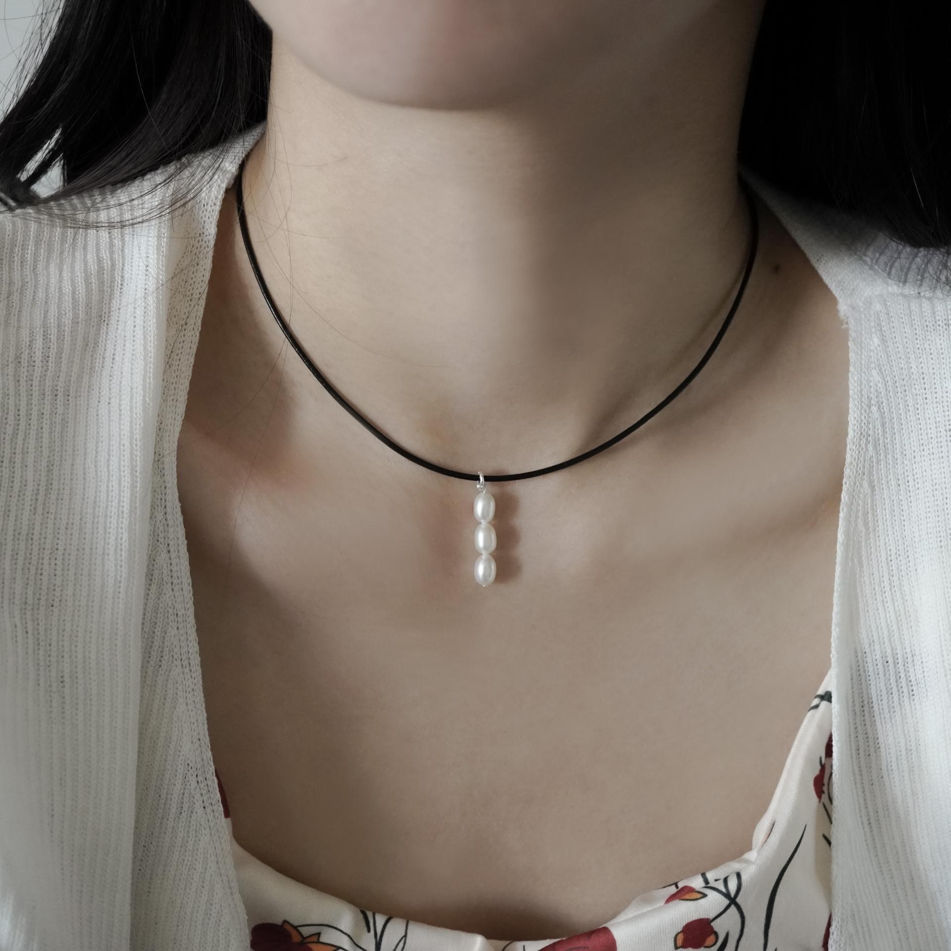 가죽목걸이가 세련된 조화를 만들어
