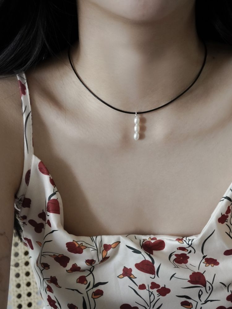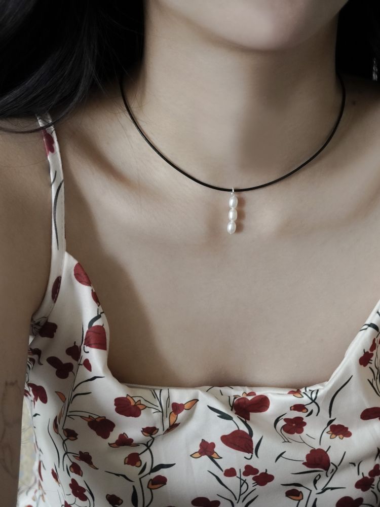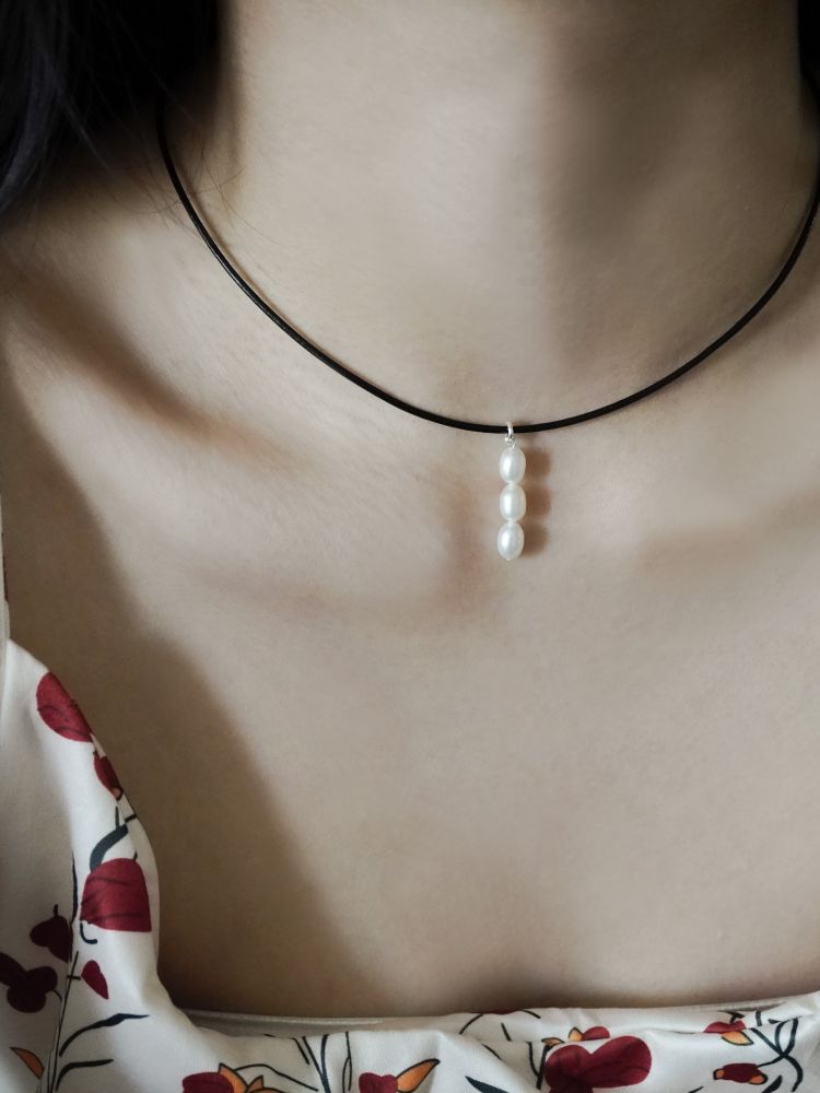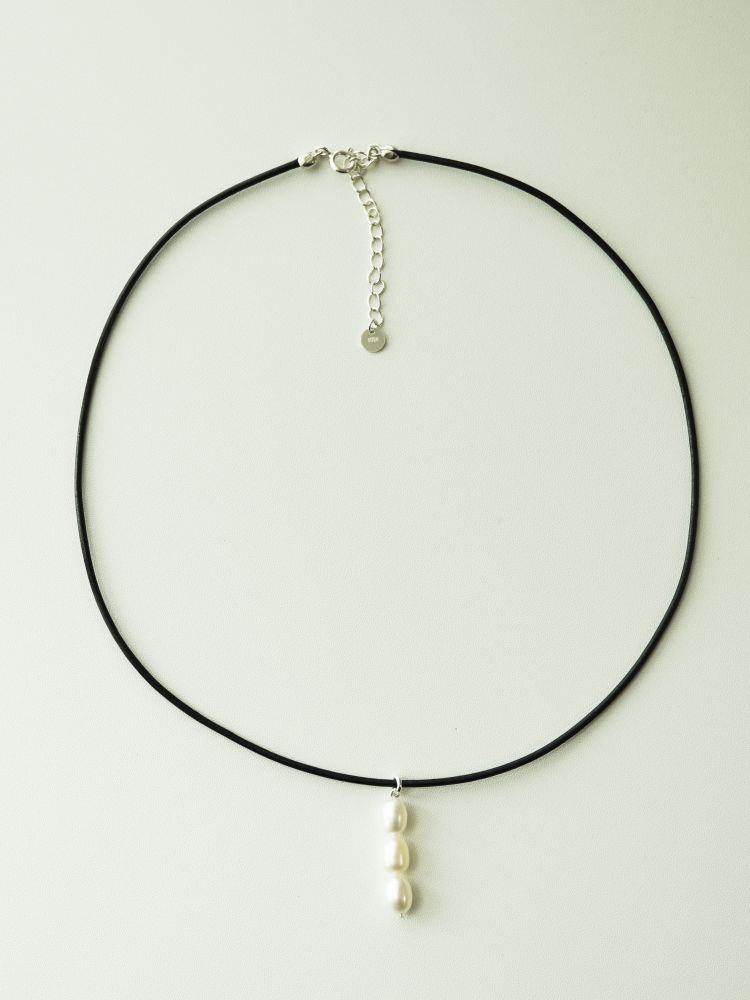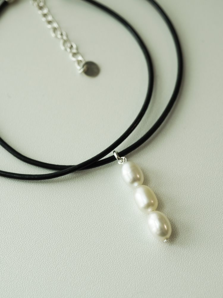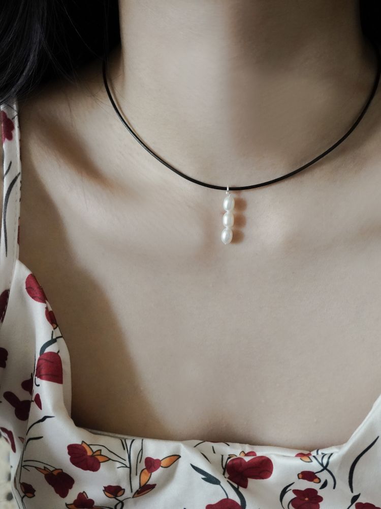 가죽목걸이가 세련된 조화를 만들어